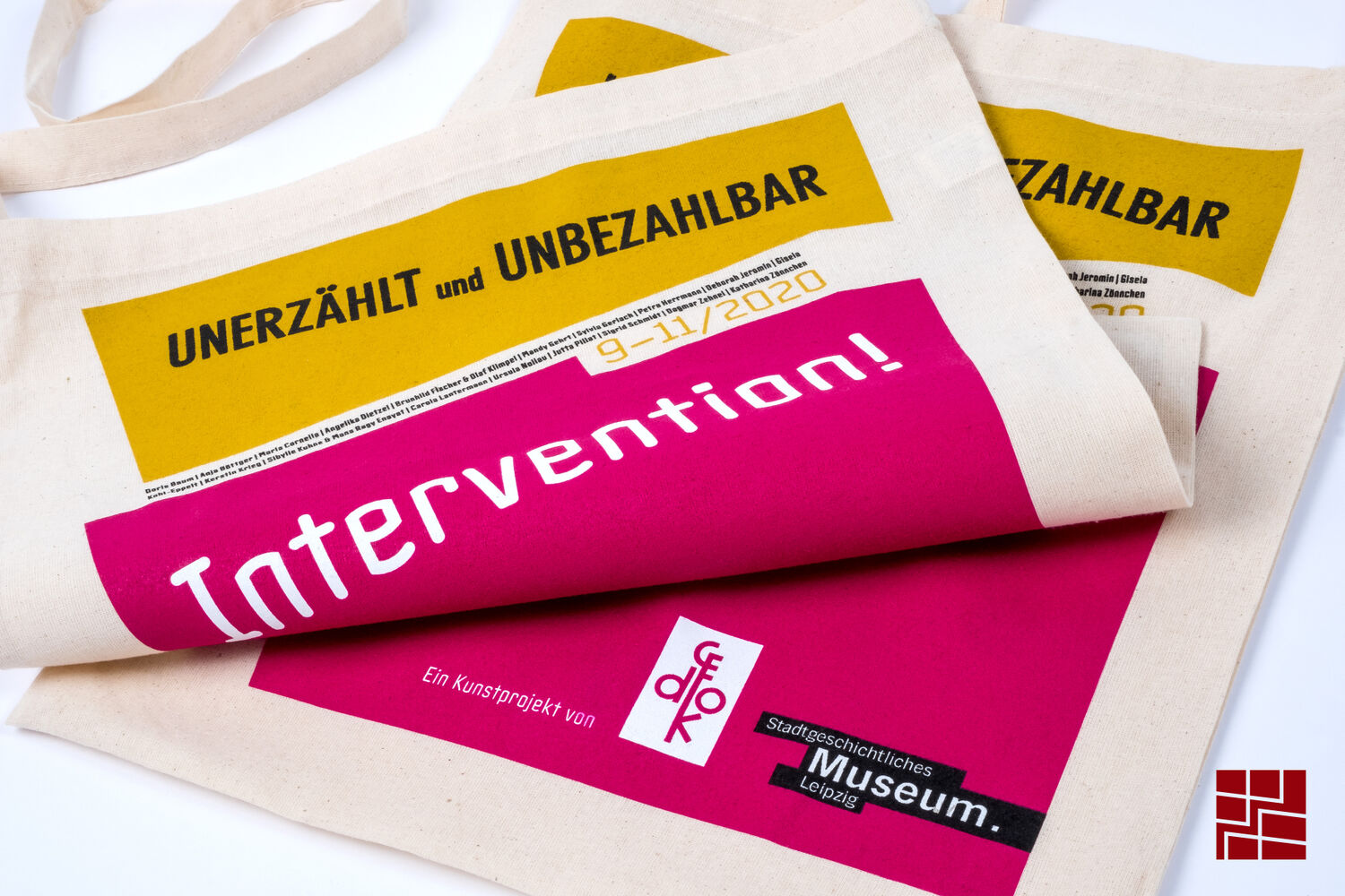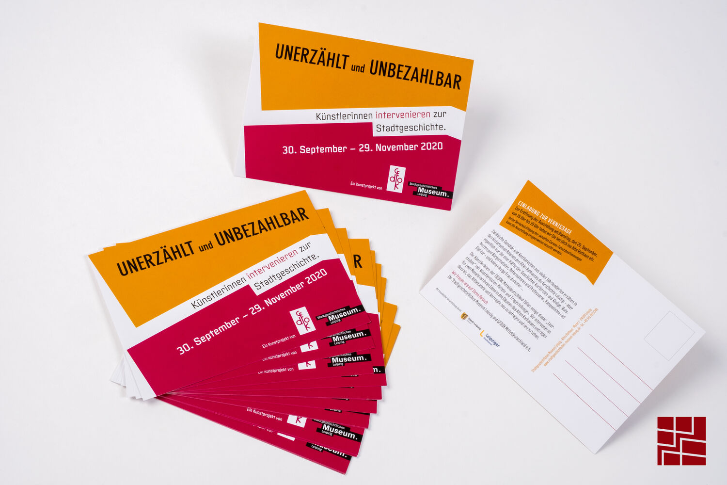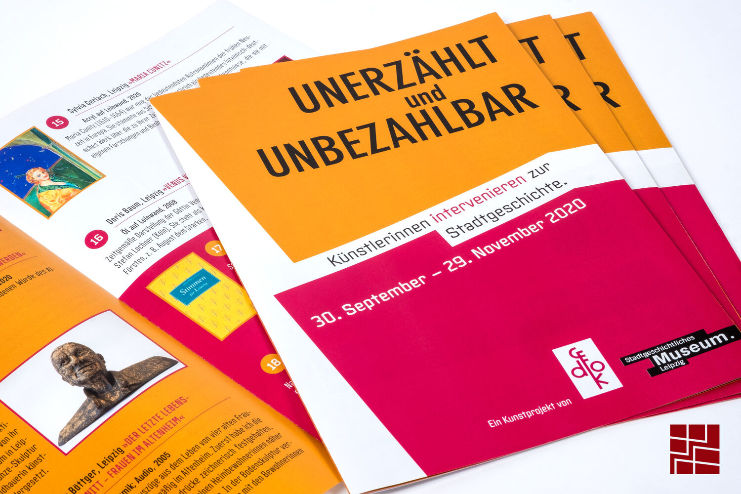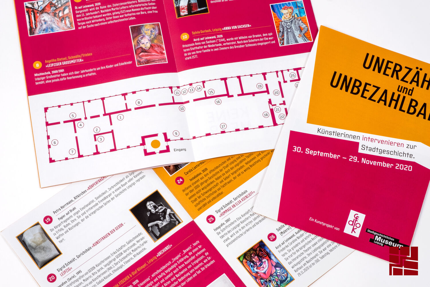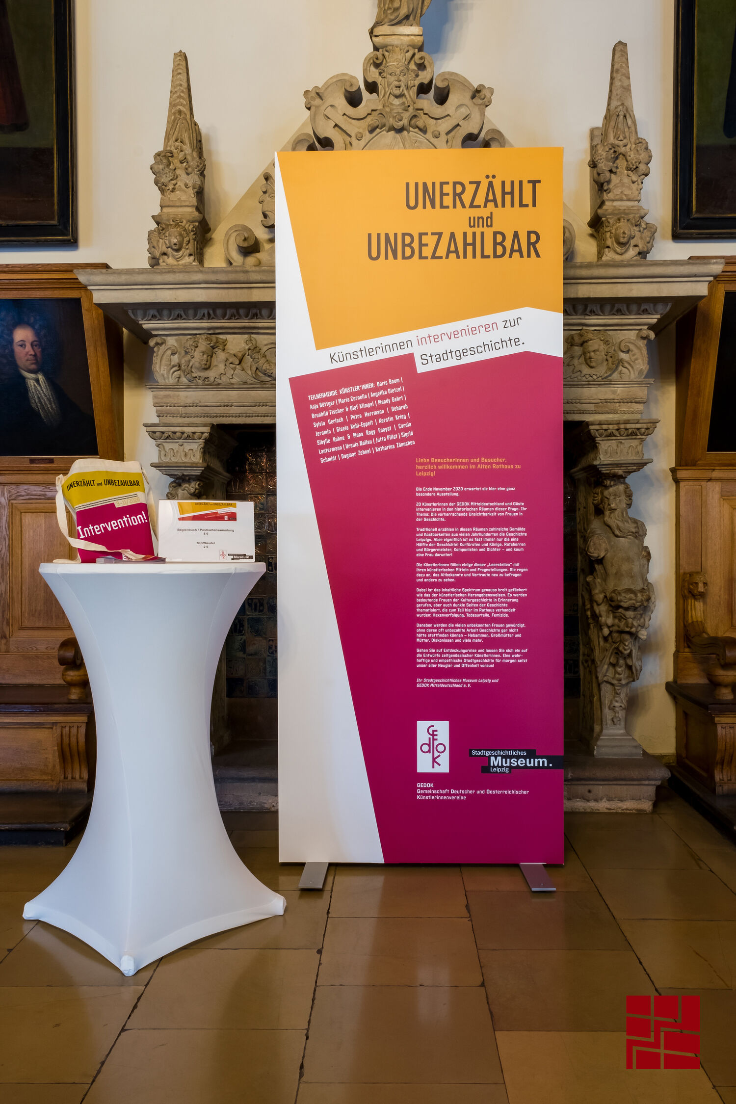 In den historischen Räumen des Alten Rathauses erwarten die Besucher:innen unzählige Exponate verschiedenster Couleur sowie Gemälde und andere kostbare Kunstwerke aus vielen Jahrhunderten. Sie erzählen die Geschichte der Stadt, von Kurfürsten und Königen, Ratsherren und Bürgermeistern, Reformatoren und Professoren, Komponisten und Dichtern – doch nur von sehr wenigen Frauen. GEDOK Mitteldeutschland e.V. rief deshalb Künstlerinnen aller Sparten auf, sich mit der Sichtbarkeit von Frauen in der Stadtgeschichte künstlerisch auseinanderzusetzen. Für die daraus resultierende Ausstellung wurde ein Corporate Design entwickelt, welches auf alle benötigten Elemente übertragen wurde. Das Thema der Intervention wurde mit der Wahl zweier serifenloser Schriften – einer sachlich geprägten und einer trotz Abrundungen eckig wirkenden –, der gedanklichen Unterbrechung der bisherigen Sicht durch Ecken und Kanten sowie durch zwei markante und damit weithin sichtbare Farben gestalterisch umgesetzt.