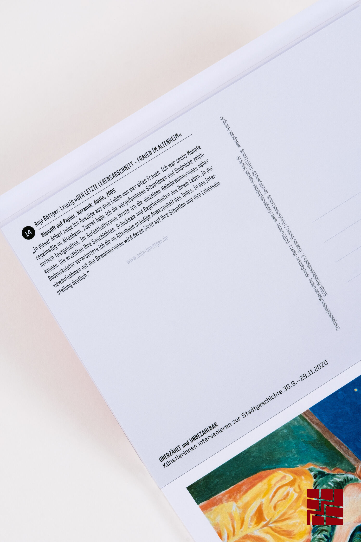 Plakat, Stellwand im Entrée des Festsaales (1,00 x 2,50 m), Beschriftung der Kunstobjekte, Banner für die Außenwerbung (5,85 x 0,70 m), Slider für Social Media, Einladungskarten, Begleitfaltblatt mit 8 Seiten, Ausstellungskatalog in Form eines Postkartenbuches, Stofftasche im Siebdruck