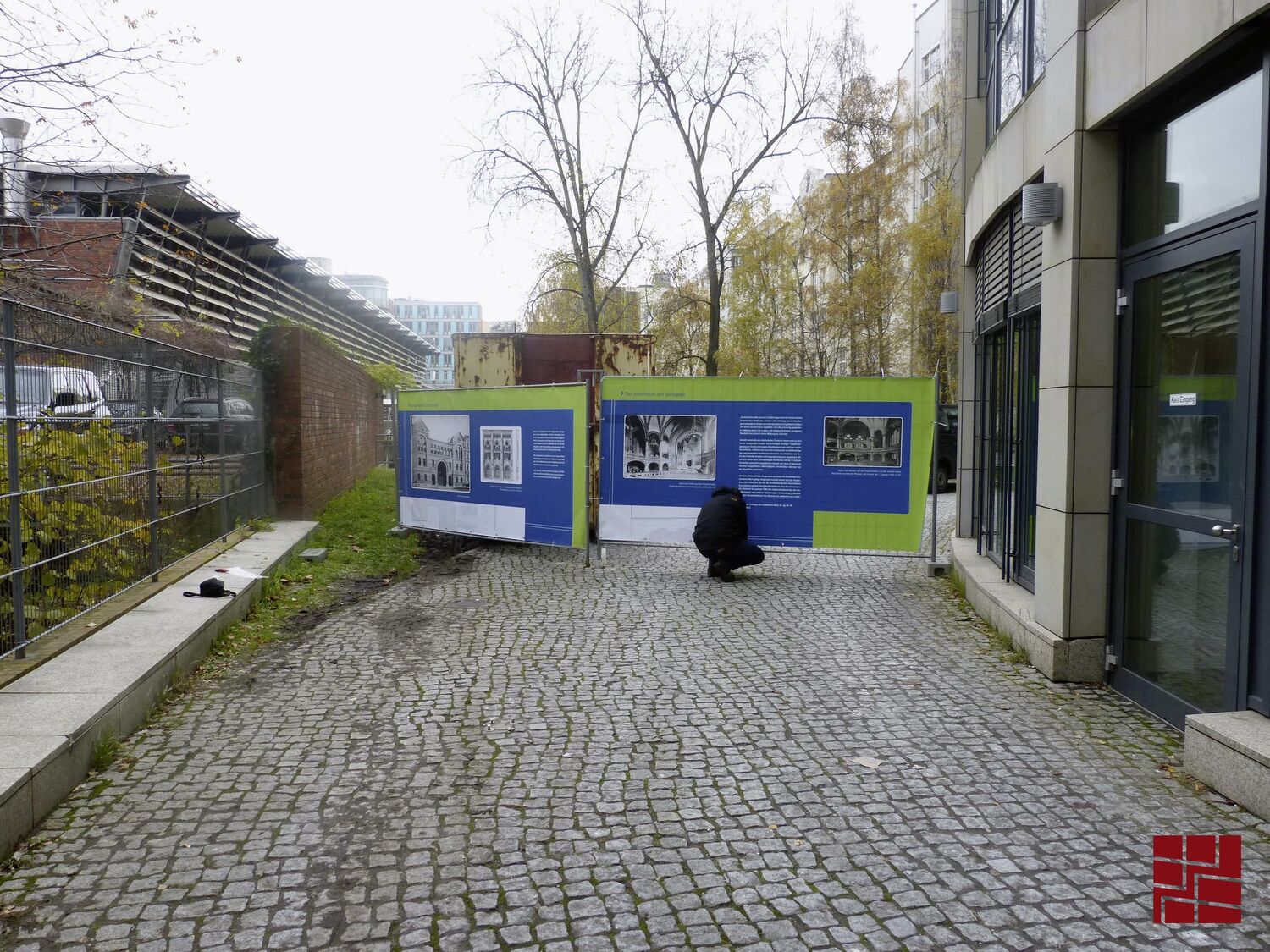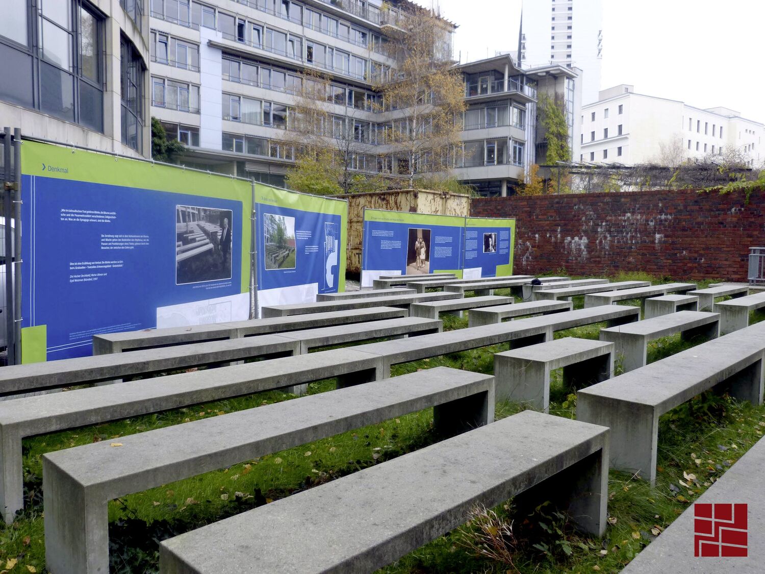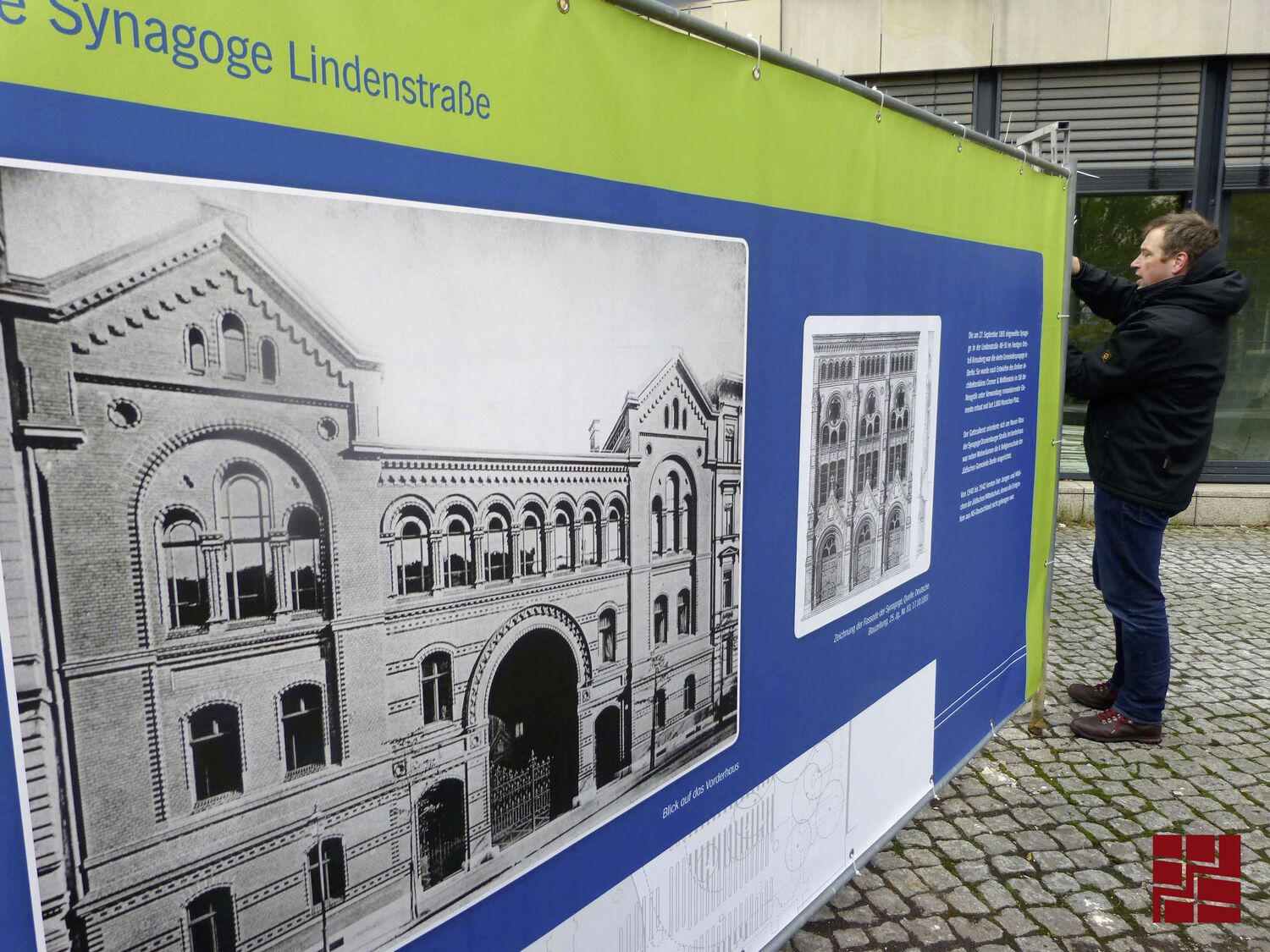 Die Barmer Krankenkasse wollte mit Bauzaun-Informationstafeln eine Baustelle verdecken. So entstanden für diese Zeit 6 Banner in der Größe 3,40 x 1,73 m mit Bildern und Informationen zur Gedenkstätte „Synagoge Lindenstraße“, die sich dort ursprünglich befand.