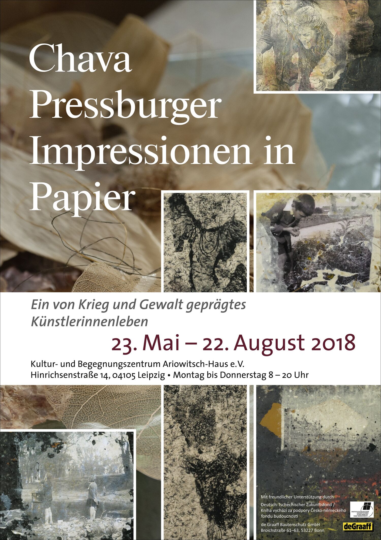 Für „Chava Pressburger – Impressionen in Papier“ wurde ein Plakat DIN A2 gestaltet, das vor Ort sowie auch an Orten mit kunstinteressiertem Publikum die Ausstellung anzeigte.