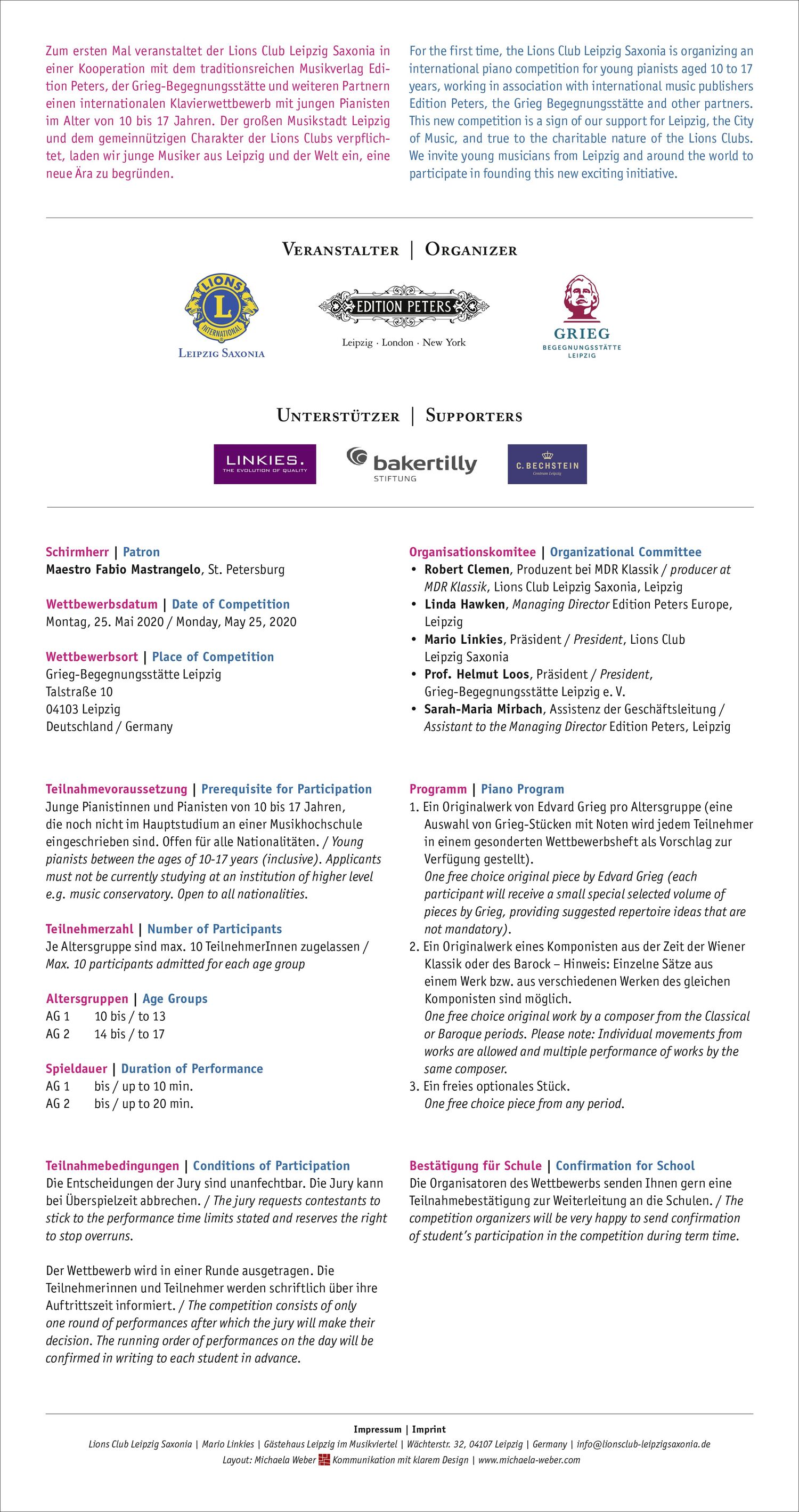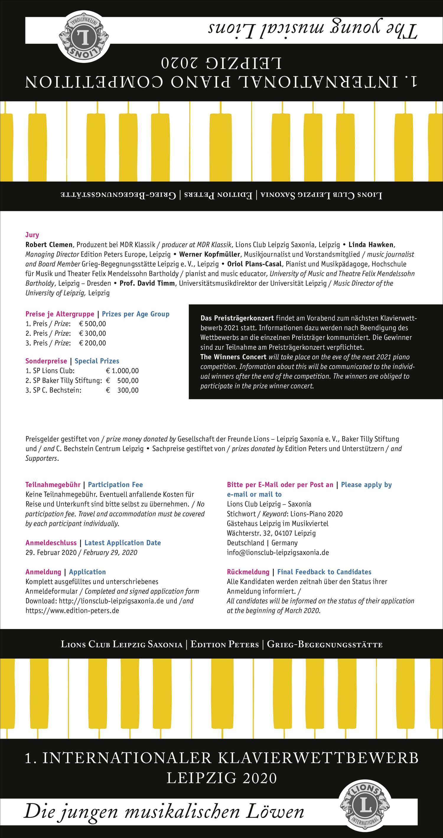 Der Lions Club Leipzig Saxonia richtet in Kooperation mit Edition Peters und der Grieg Begegnungsstätte 2020 erstmalig einen Klavierwettbewerb aus. Dafür wurde ein Faltblatt mit 8 Seiten der Größe 10,5 x 21 cm erstellt, um über die Verteilung an Musikschulen, Klavierschulen ect. potentielle Teilnehmende zu ereichen.