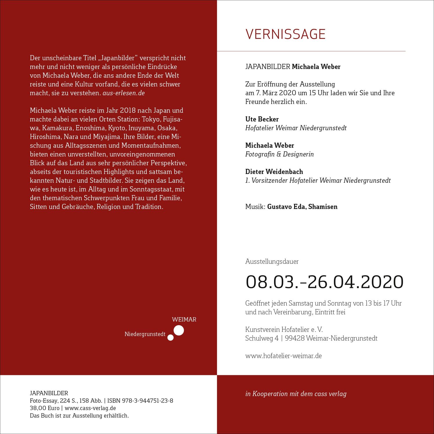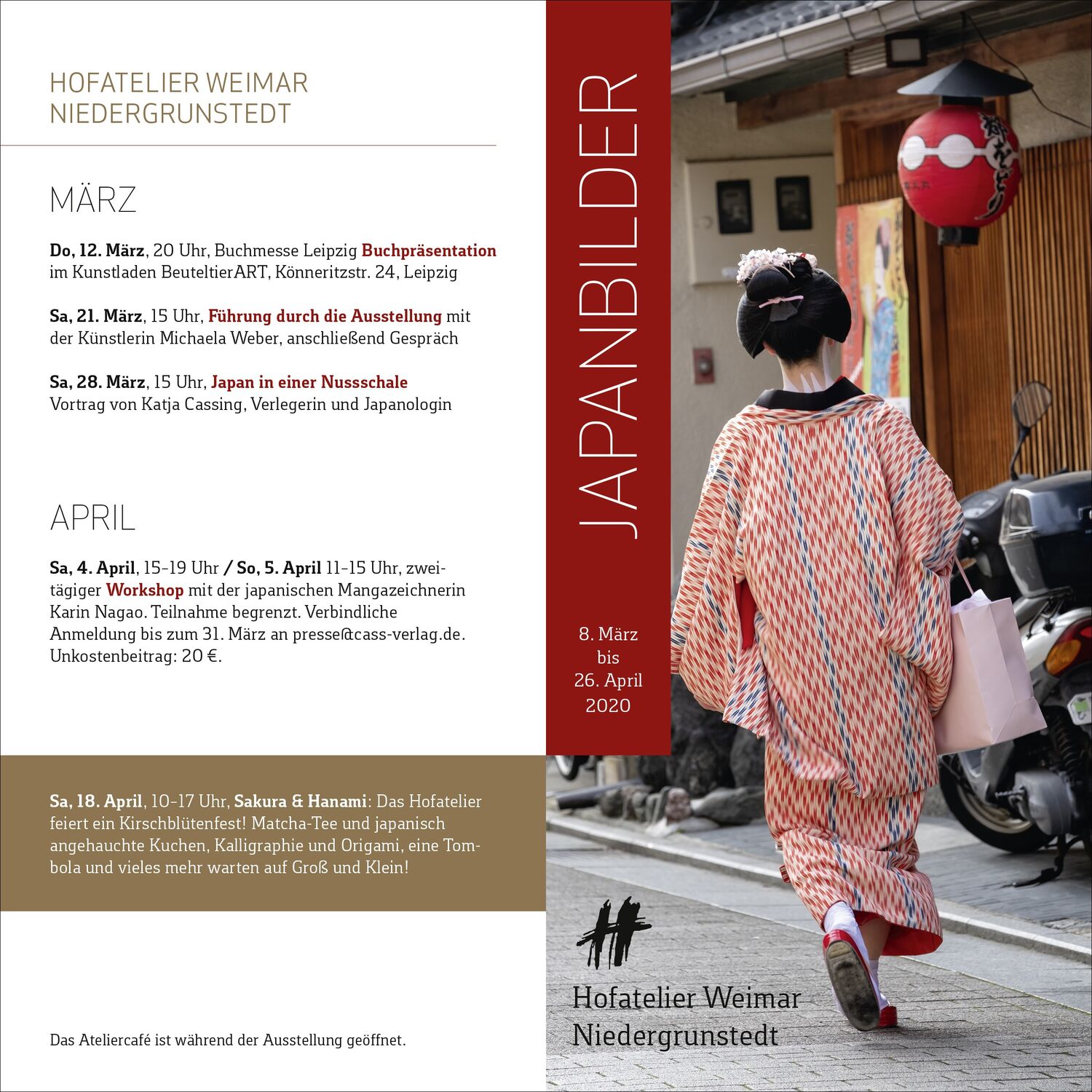 Für die Ausstellung JAPANBILDER im Hofatelier entstand ein Faltblatt mit 4 Seiten der Größe 10,5 x 21 cm, um kompakt Informationen über die Ausstellung und das Begleitprogramm im Hofatelier Weimar Niedergrunstedt sowie das Buch an Interessierte gedruckt und online zu versenden und Neugier zu wecken. Das Design des Faltblatts übernimmt dabei Gestaltungselemente des Buches wie Schriften, Formen und Farben.