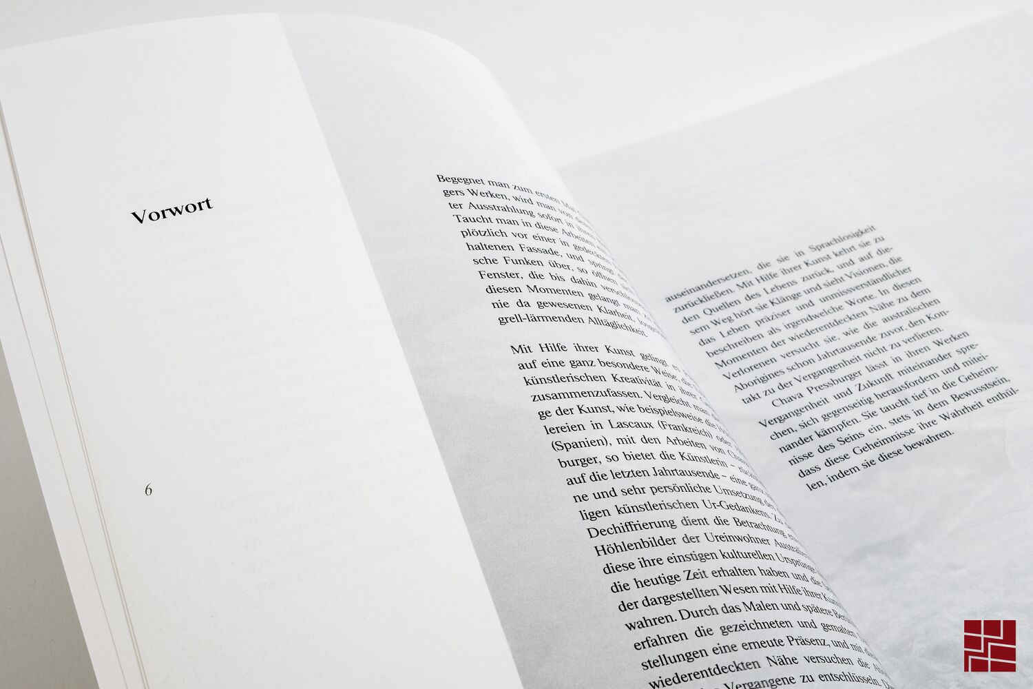 Das Buch stellt Leben und Werk der Künstlerin Chava Pressburger vor. Der erste Teil mit Biografie, Erläuterungen und Interpretationen ihres Werks ist in SW, der Werkteil dagegen vierfarbig gedruckt. Für den Text wurde entsprechend ihres zurückhaltenden Werks eine ruhige Serifenschrift gewählt, genau wie die Überschriften und Bildtitel ihrer Werke. Nur die Bildinformationen wie Größe und Technik sind in einer serifenlosen Schrift gesetzt.