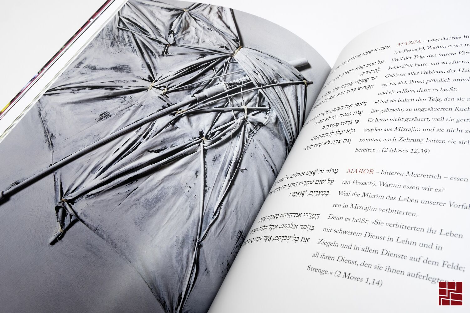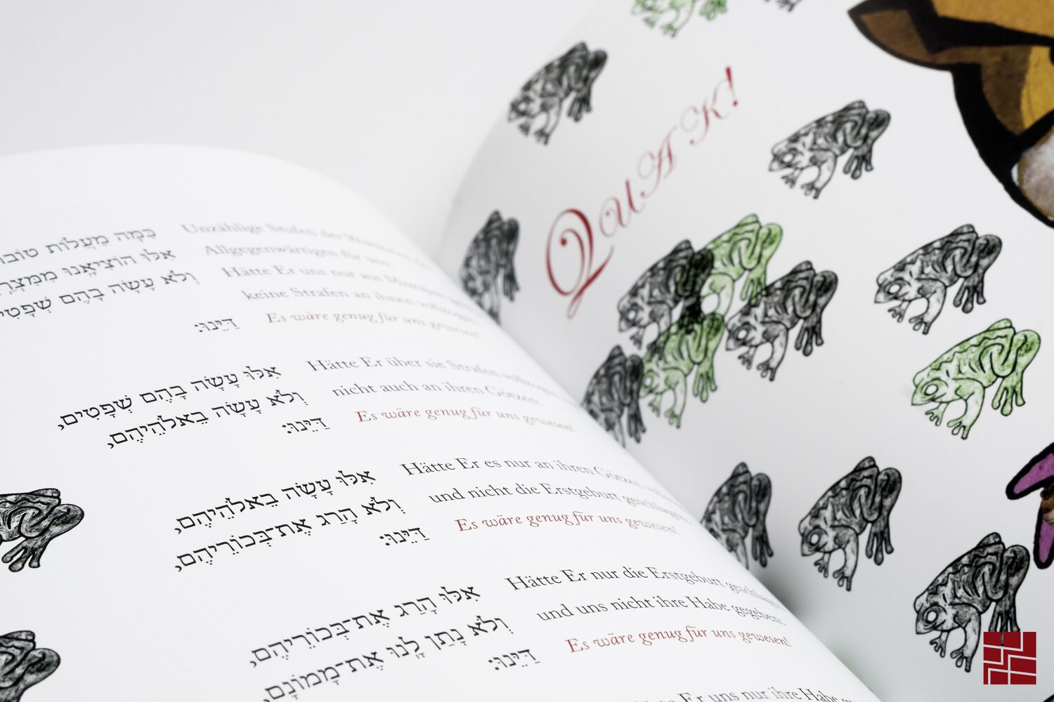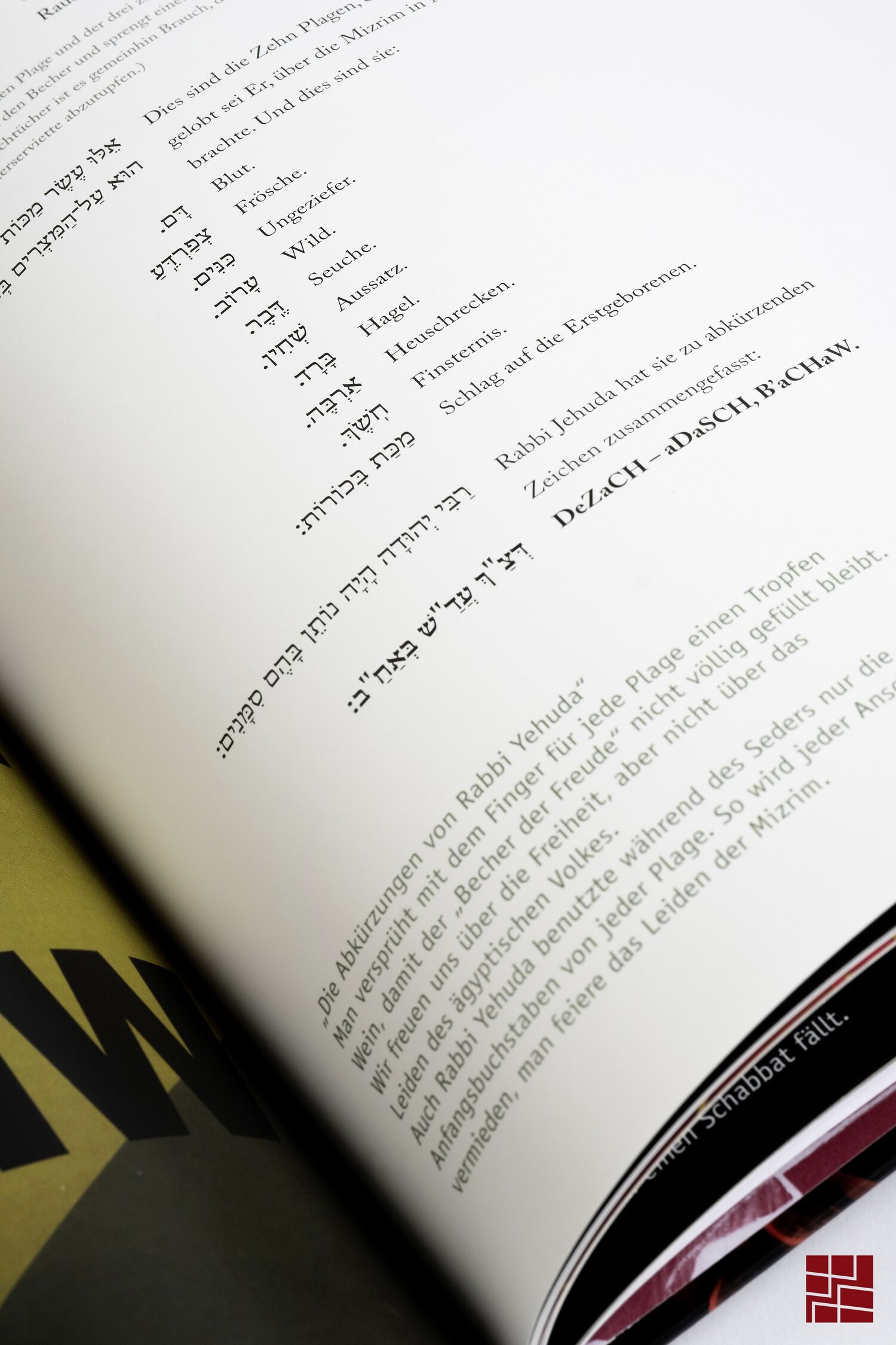 Das Buch mit den ein- oder doppelseitigen Illustrationen wird entsprechend der hebräischen Leserichtung von rechts nach links gelesen. Die hebräischen und deutschen Texte in Serifenschrift sind ab und zu mit weißer Schrift auf schwarzem Grund gesetzt. In der Marginalspalte oder den Text unterbrechend sind Erläuterungen oder Handlungsanweisungen in kleinerer und grauer Schrift vermerkt. Zum Teil sind Hervorhebungen in Rot versehen und erläuternde Texte zu den Bildern in einer serifenlosen Schrift und zurückhaltendem Grün gesetzt. Auf dem Umschlag steht der Buchtitel auf weißem transparenten Grund, der zudem geprägt wurde. Auch das Vor- und Nachsatzpapier wurde mit Illustrationen einfarbig bedruckt.